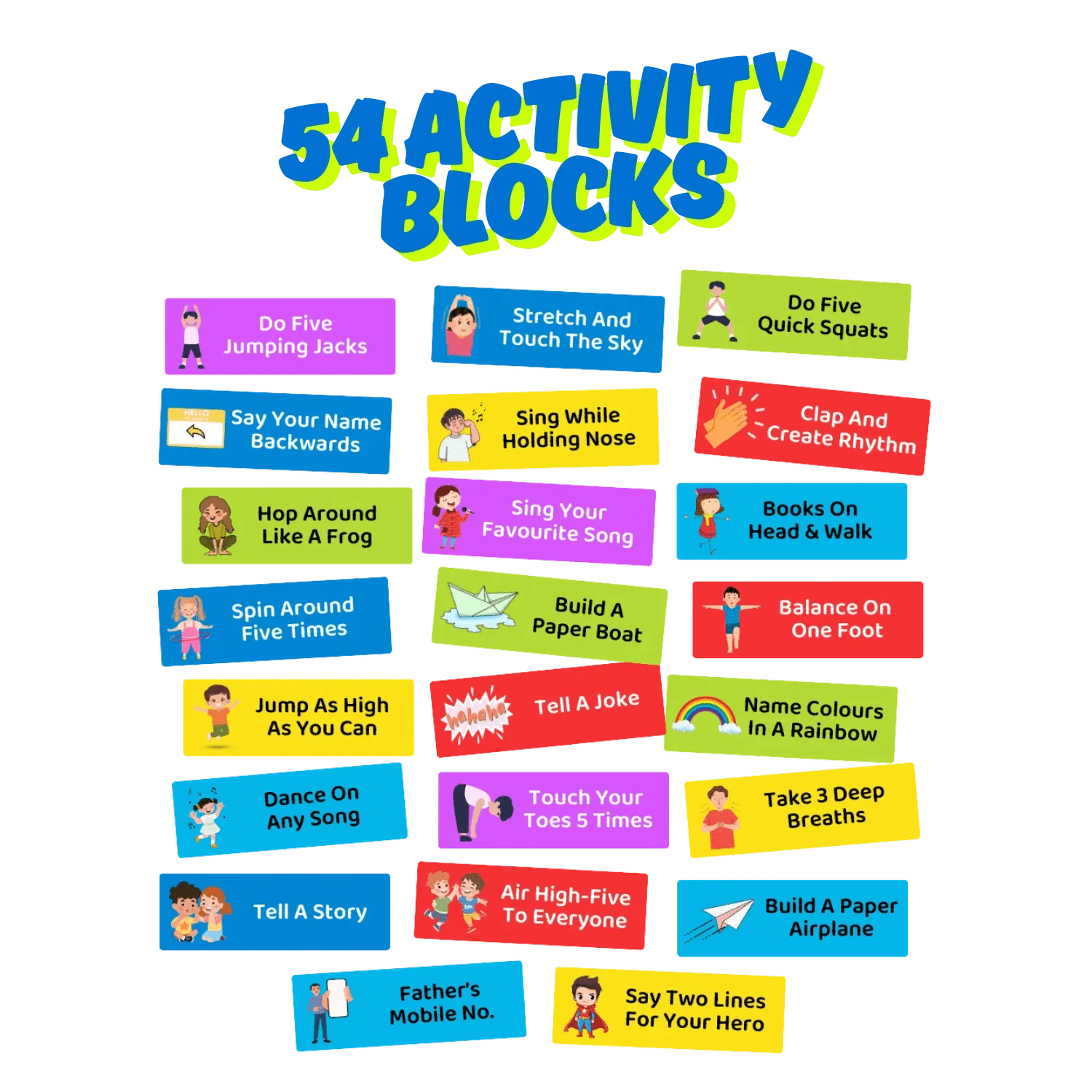 Unlock a world of excitement with our Kids Activity Tower Block! Each block comes with a unique challenge designed to boost physical activity, memory, creativity, and social skills. From fun movements to mindful yoga, laughter, and learning—every turn brings a new adventure! Let the games begin! 🎉